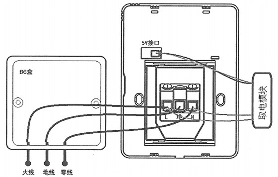 [第1步:接线]图示为接线图,取电模块一端分别接零线和火线,另一端为5V输出线,接室温采集器后端5V接口。市电的零线、火线、地线分别接到插座的零线、火线、地线接口。